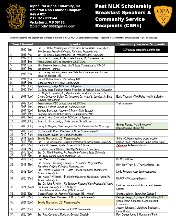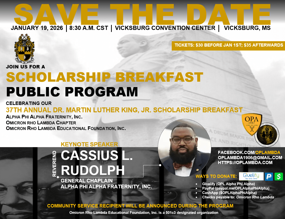 38TH ANNUAL DR. MLK, JR. SCHOLARSHIP BREAKFAST - JAN 18, 2027 @ 0830 VICKSBURG CONVENTION CENTER